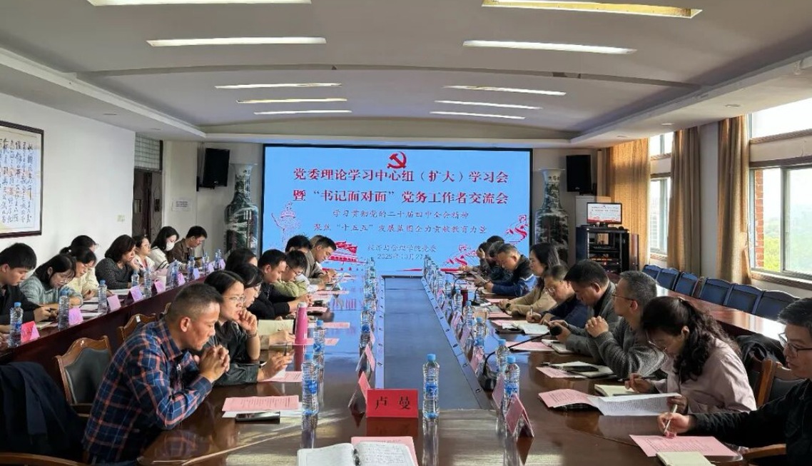 10月27日,学院召开党委理论学习中心组(扩大)学习会议,专题传达学习党的二十届四中全会精神,研究部署学院贯彻落实工作。学院全体党支部书记、科级干部、系主任以及辅导员、组织员40余人参加会议,经济发展研究院院长、民主党派人士卢宇荣列席会议。会议由学院党委书记许婕主持。