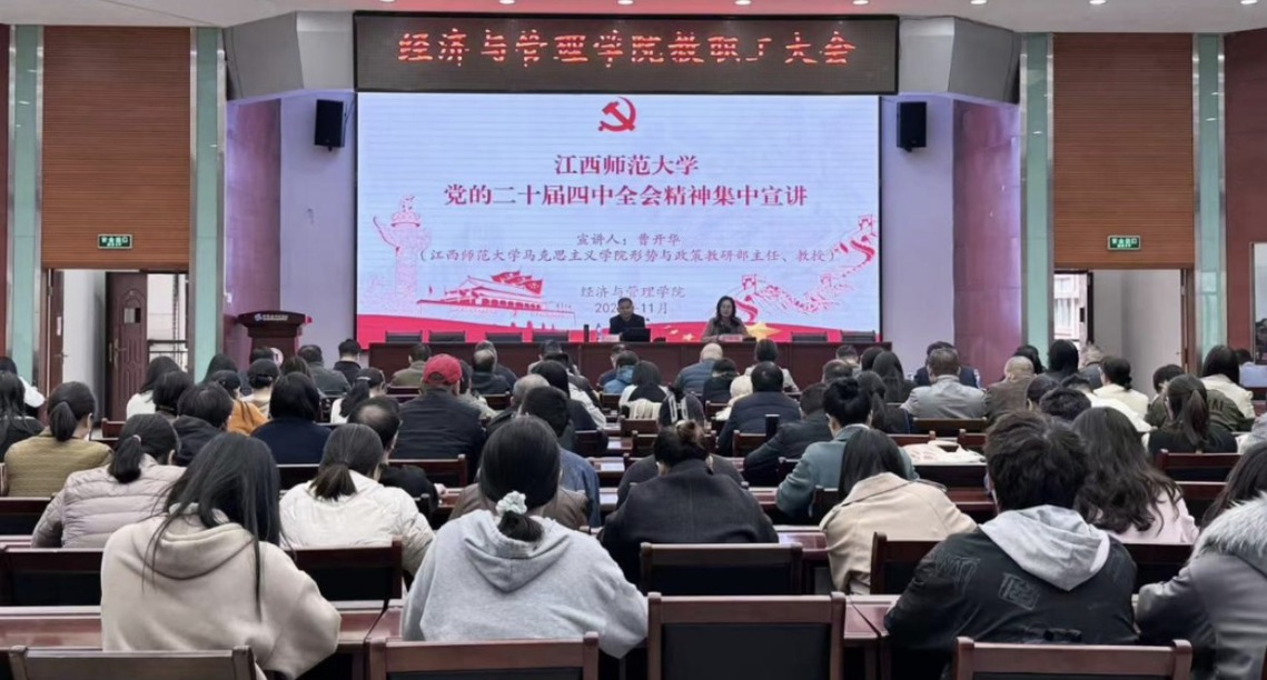 根据学校统一安排,11月11日下午,经济与管理学院党委在名达楼6301东报告厅组织开展党的二十届四中全会精神集中宣讲。马克思主义学院形势与政策教研部主任曹开华教授来院作专题宣讲报告。学院党政班子成员、全体教职工和本硕博学生代表共计180余人现场聆听。学院党委书记许婕主持报告会。