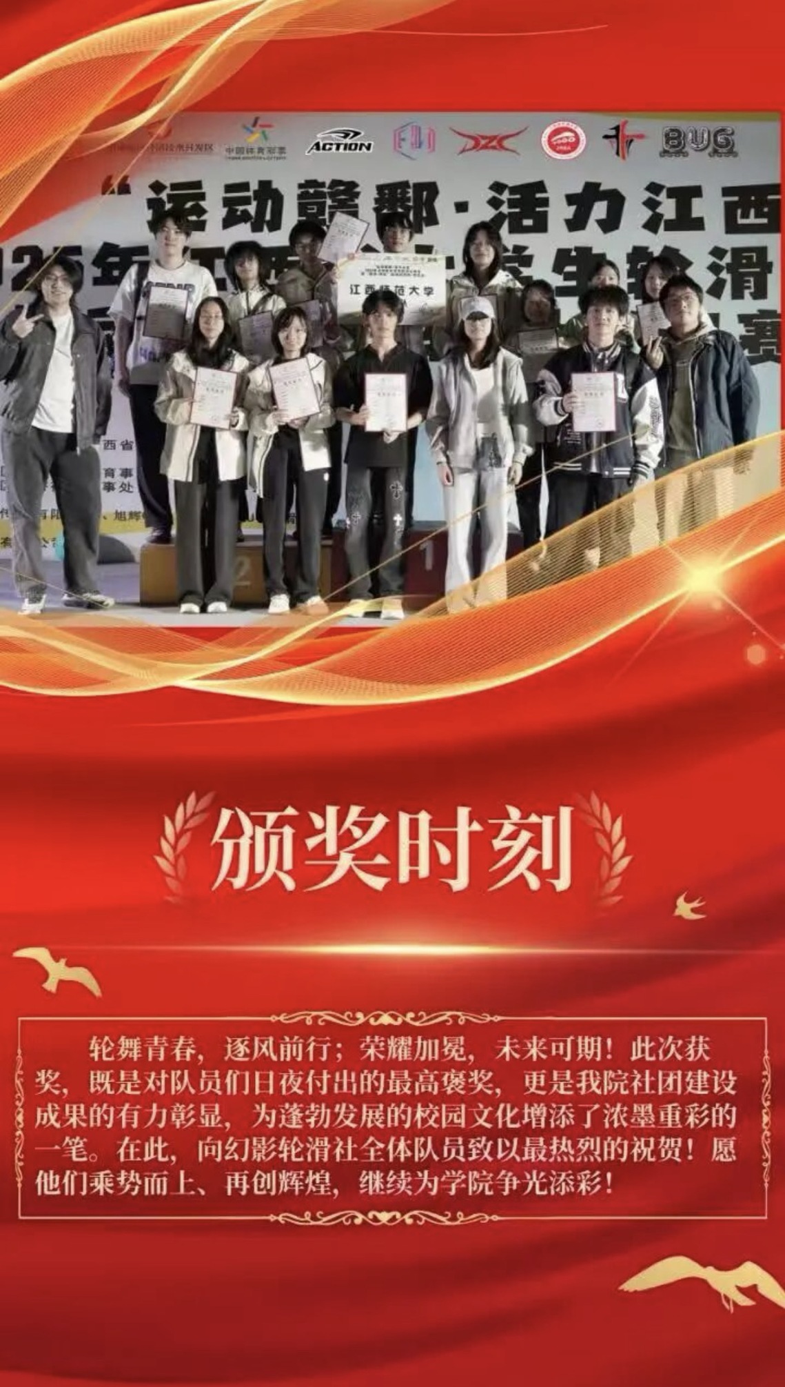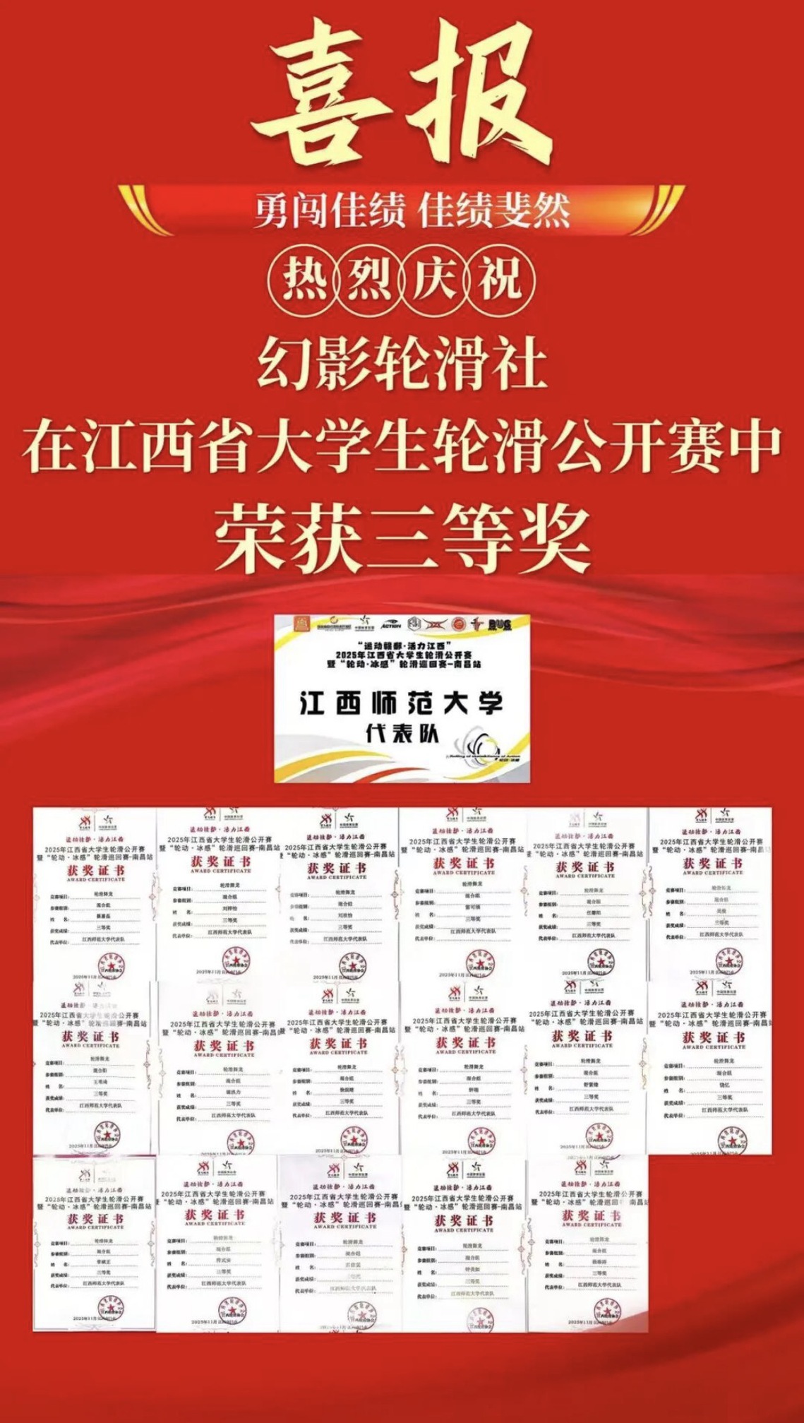 金秋送爽,11月15日下午,在2025年江西省大学生轮滑公开赛暨“轮动·冰感”轮滑巡回赛——南昌站中,我院幻影轮滑社的队员们,经过三周的刻苦集训与赛场上的顽强拼搏,从众多高校队伍中脱颖而出,荣获省级三等奖的优异成绩!