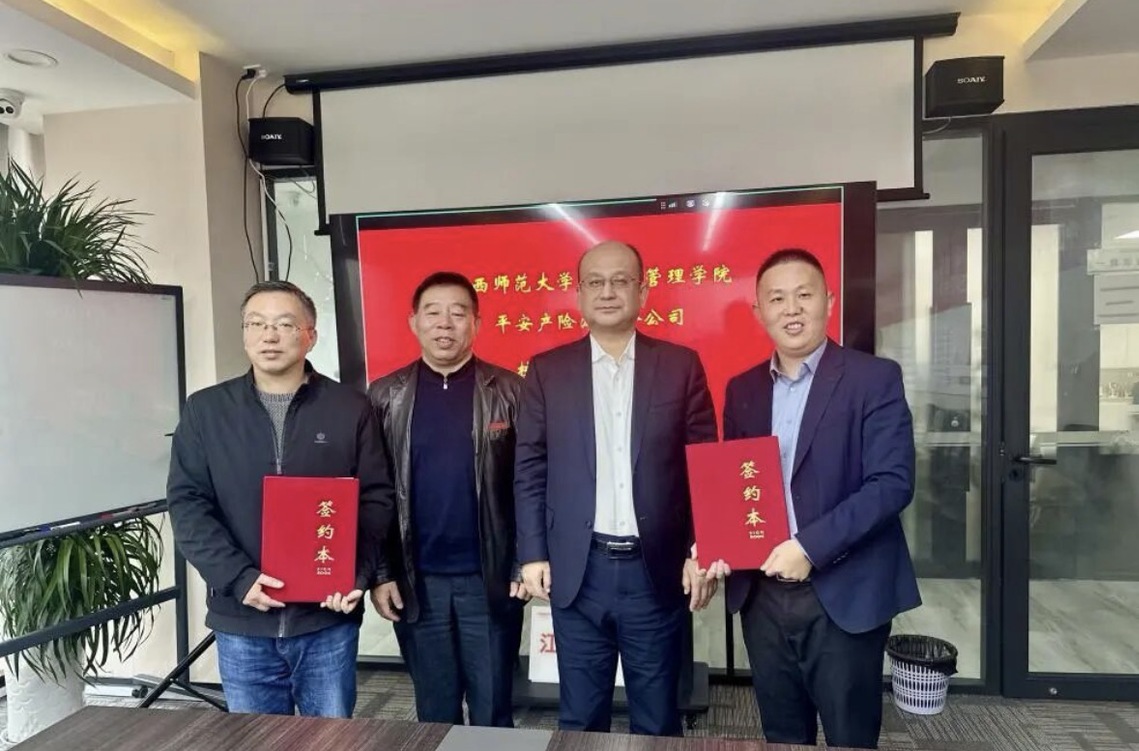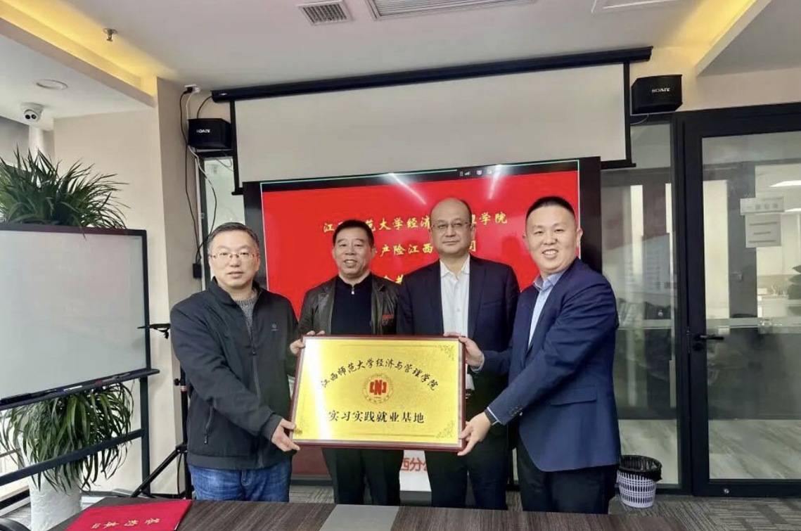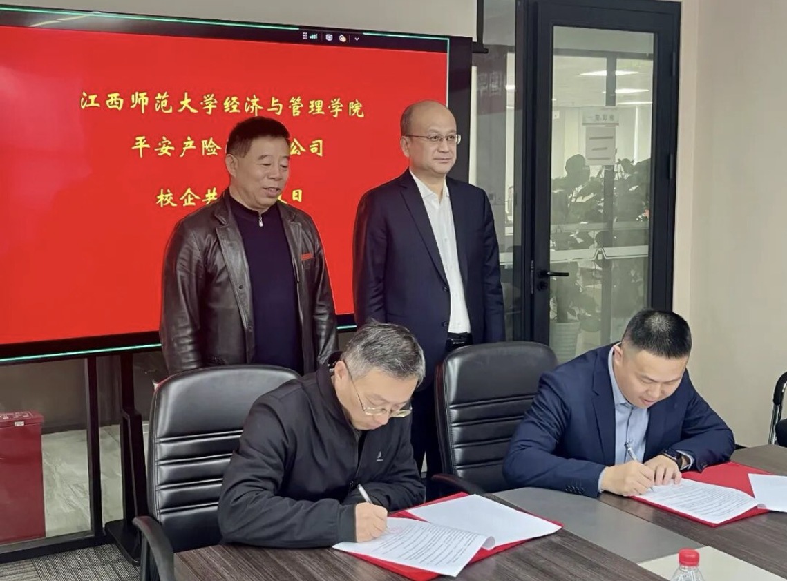11月20日下午,江西师范大学经济与管理学院与中国平安财产保险股份有限公司江西分公司(以下简称“平安产险江西分公司”)校企交流暨实习实践就业基地签约授牌仪式,在平安产险江西分公司16楼1号会议室顺利举行。平安产险江西分公司党委书记、总经理郝瑞林,创展渠道总监张波(优秀校友),人事行政部经理阙俊峰,消保室主任余梦婷(优秀校友),学院党委副书记江新喜,副院长熊智伟,及双方相关工作人员出席仪式。