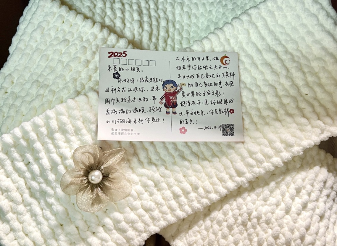 围巾收集现场,志愿者们细心整理每一条围巾,抚平每一处褶皱,将编织好的围巾与写满祝福的明信片一同交付。一句句真挚的寄语跃然纸上——“愿你裹着温暖长大,永远开心,眼里有光”“静待花开,愿你健康成长,平安快乐”,不少同学还画上可爱的图案,用充满童趣的方式传递温暖与关怀。